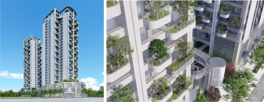 建築本身以「森林垂直化」為概念:量體退縮、露台層層堆疊,綠意沿著立面向上延伸;白色量體中的開口讓光與風得以穿透,使視覺輕盈而靜謐。